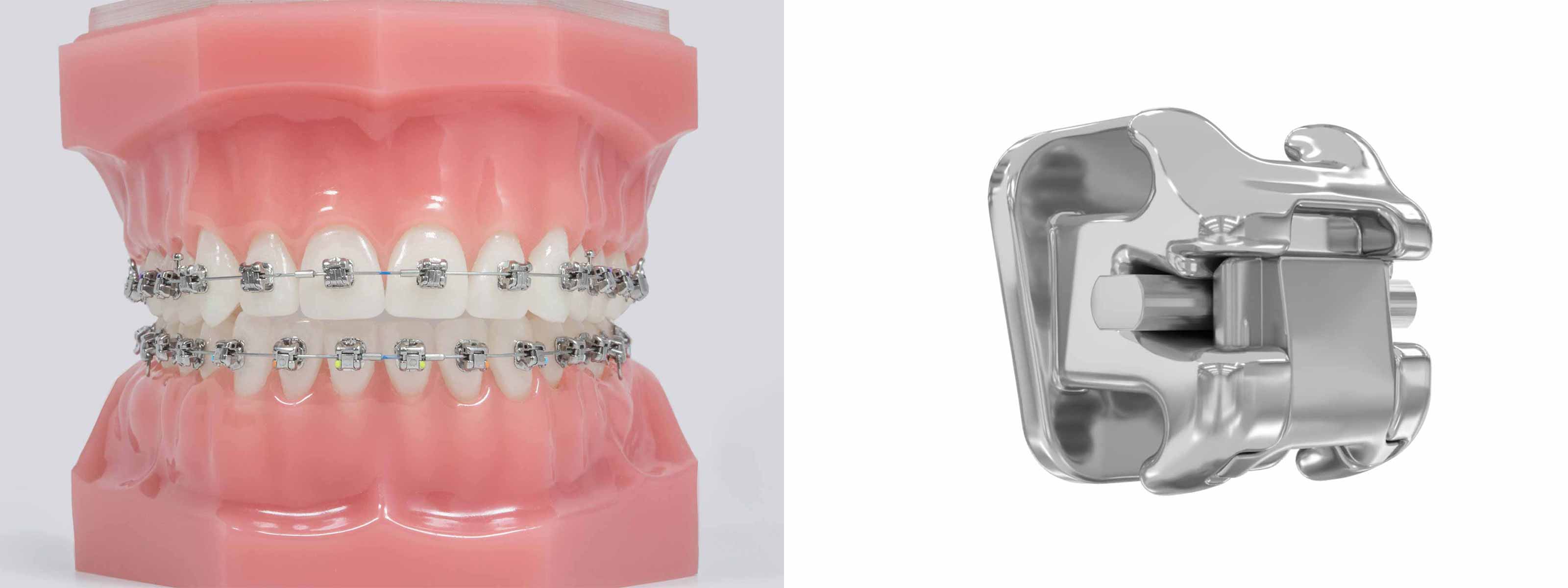 Die Standardkassenbrackets bestehen aus Metall mit seitlichen Flügeln. Ein Gummiring wird über die Flügel gespannt und sichert den Bogen, der von Bracket zu Bracket verläuft und die erforderliche Kraft für die Zahnbewegung auf die Zähne überträgt.