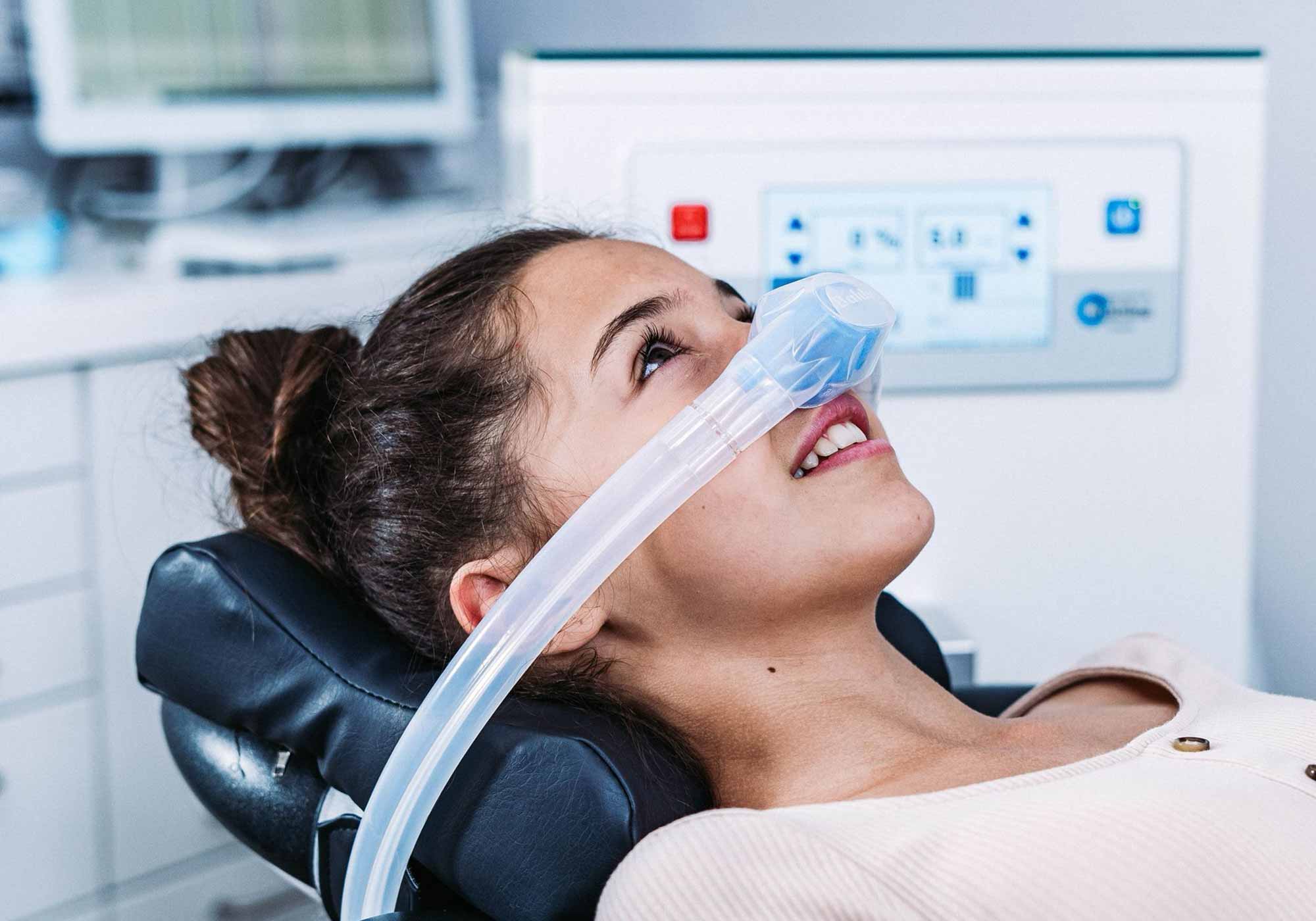 Für ängstliche Kinder oder solche mit Würgereiz kann eine Behandlung mithilfe eines Gemischs aus Lachgas und Sauerstoff sehr effektiv sein. Diese einfache und sanfte Methode versetzt die jungen Patienten in einen euphorischen Zustand und mindert das Schmerzempfinden. Dadurch empfindet euer Kind notwendige Maßnahmen während der Behandlung als harmlos und akzeptiert diese leichter (wie beispielsweise eine örtliche Betäubung mit Injektion).